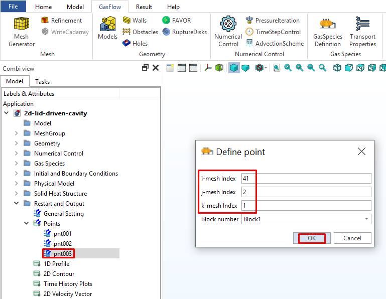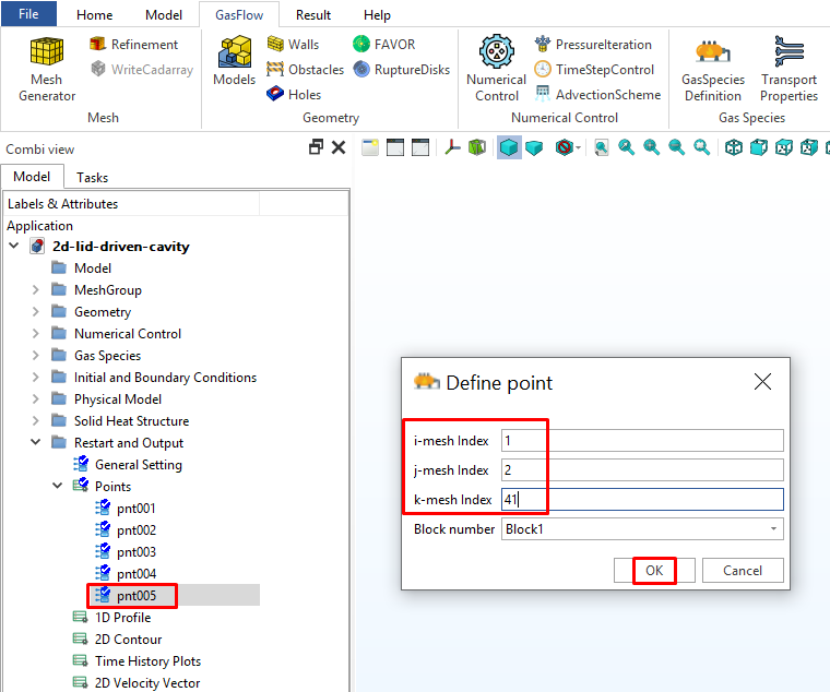 9.4 Set two points: pnt005 (i=1, j=2, k=41) and pnt006 (i=81, j=2, k=41) used to define the horizontal centerline.